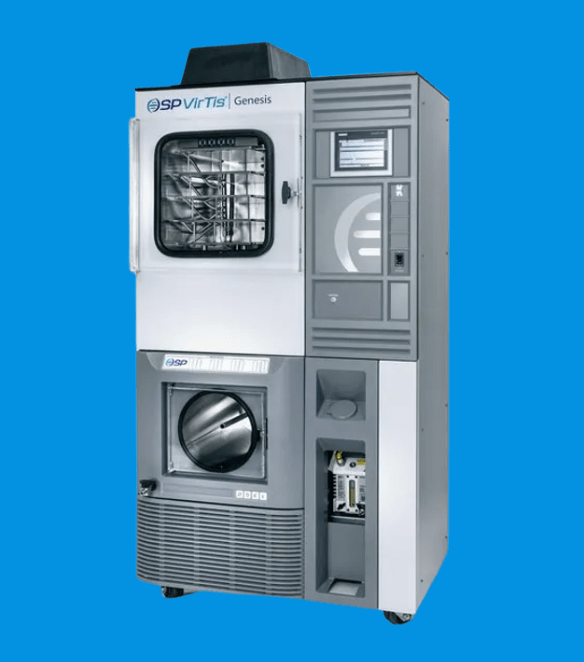 The SP Vertis Genesis Floor Model Freeze Dryer is a high-performance lyophilization system designed for research and industrial applications. It features up to 24 square feet of shelf surface area, with a maximum condenser capacity of 80 liters. The system offers precise control over temperature, pressure, and time, ensuring optimal freeze-drying conditions.